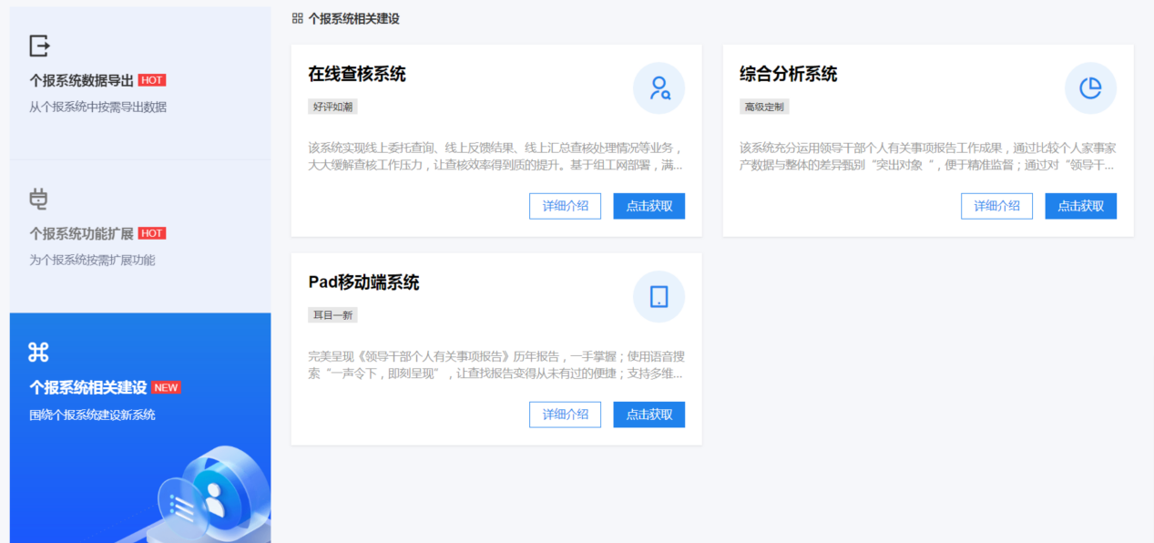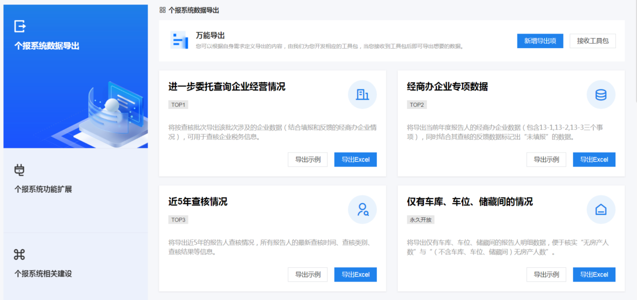 “个报管家”基于《领导干部个人有关事项报告信息管理系统》提供全方位服务,包括数据导出、功能扩展、新系统建设等,在现有可导出的Excel数据、已支持的扩展功能之外,还可以自定义要导出的Excel数据和要添加的功能。