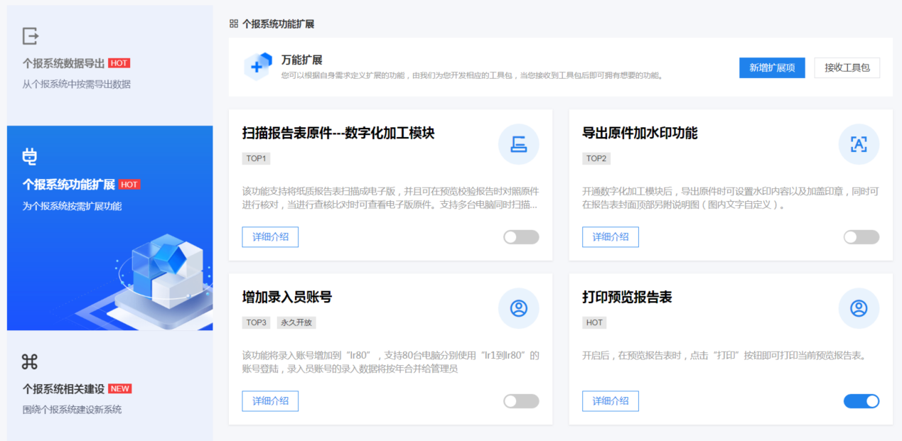 “个报管家”为您增加想要的功能,根据您自定义的功能需求,我们为您开发实现,让个报工作得心应手;同时在“个报管家”内已预置一些您可能需要的扩展功能,如“打印预览报告表”、“扫描报告表原件”、“导出电子版原件加水印”等。